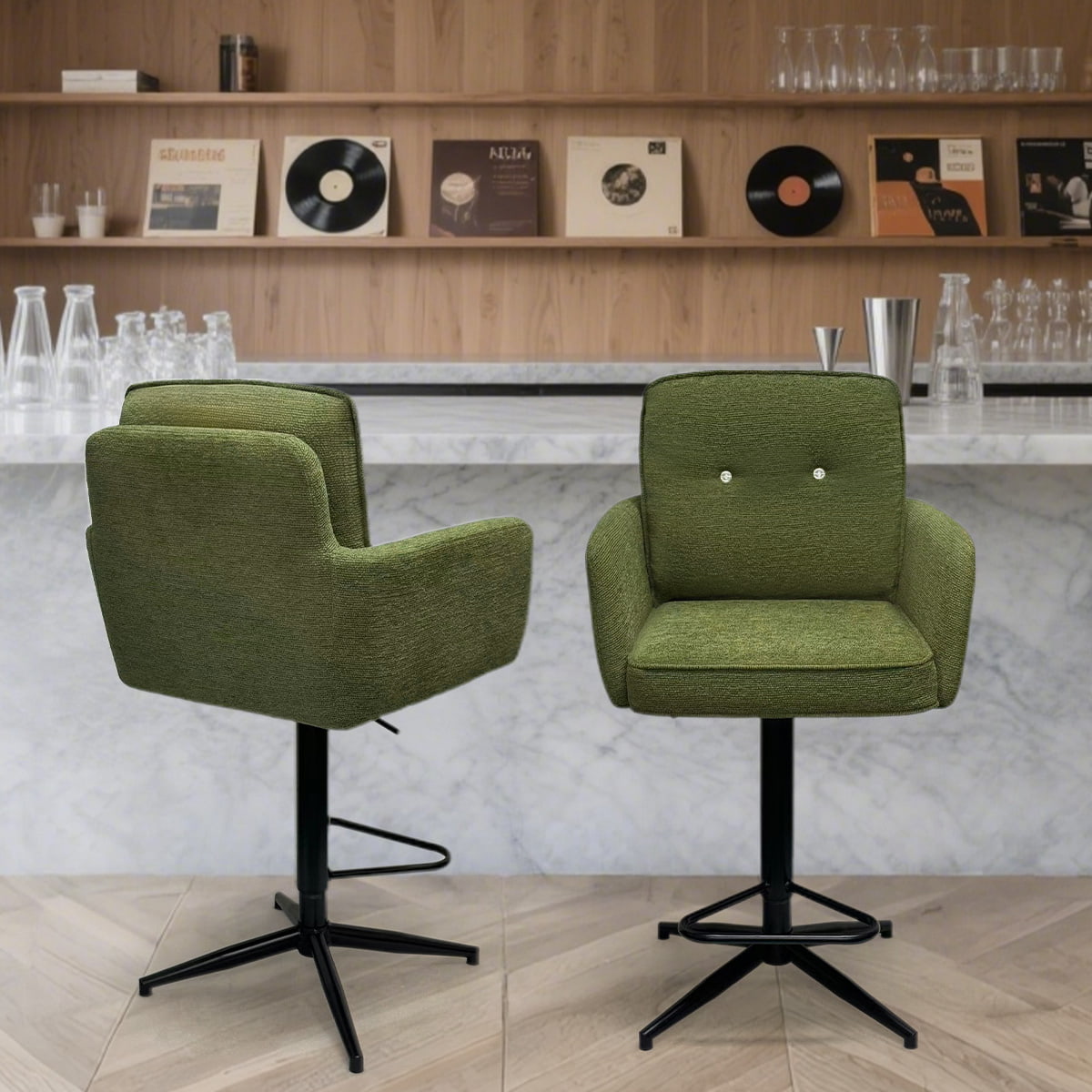 Taburete de barra giratoria ajustable de tela verde moderna con base automática y base de metal