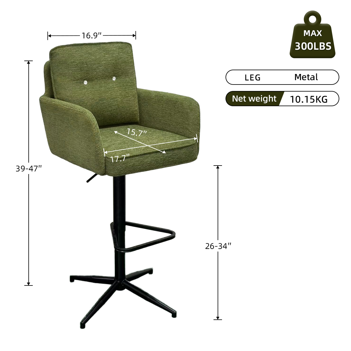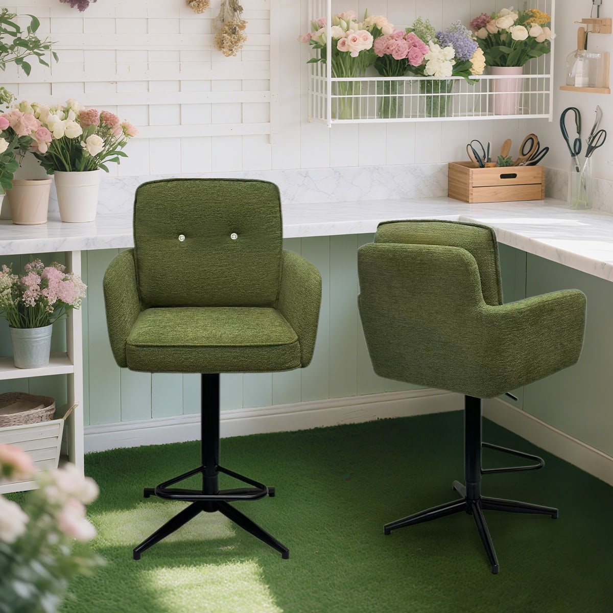 Nuestro producto insignia: el taburete moderno de bar giratoria ajustable de tela verde es ideal para bar de cocina, comedor o espacio de salón. El asiento está tapizado en tela verde, que es cómoda de tocar y fácil de limpiar. El diseño fácil de usar incluye la función de ajuste de altura; Base giratoria de 360 ° con mecanismo de retorno automático y reposapiés triangular integrado. La base estable de metal con recubrimiento de polvo negro no solo es duradera y resistente a la corrosión, sino que también tiene un diseño de soporte anti-Tip de cuatro piernas.