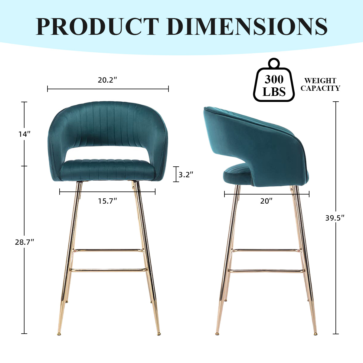 Taburetes modernos de bar de terciopelo verde azulado con patas de oro y reposapiés, sillas tapizadas con mechones