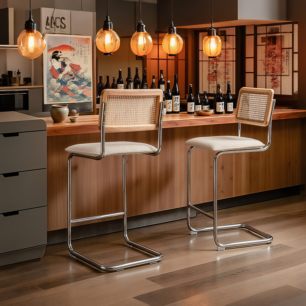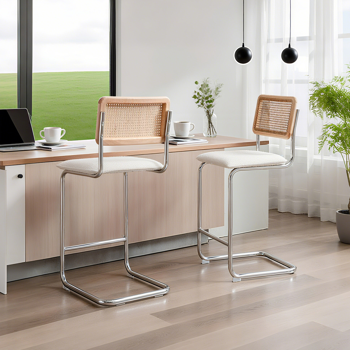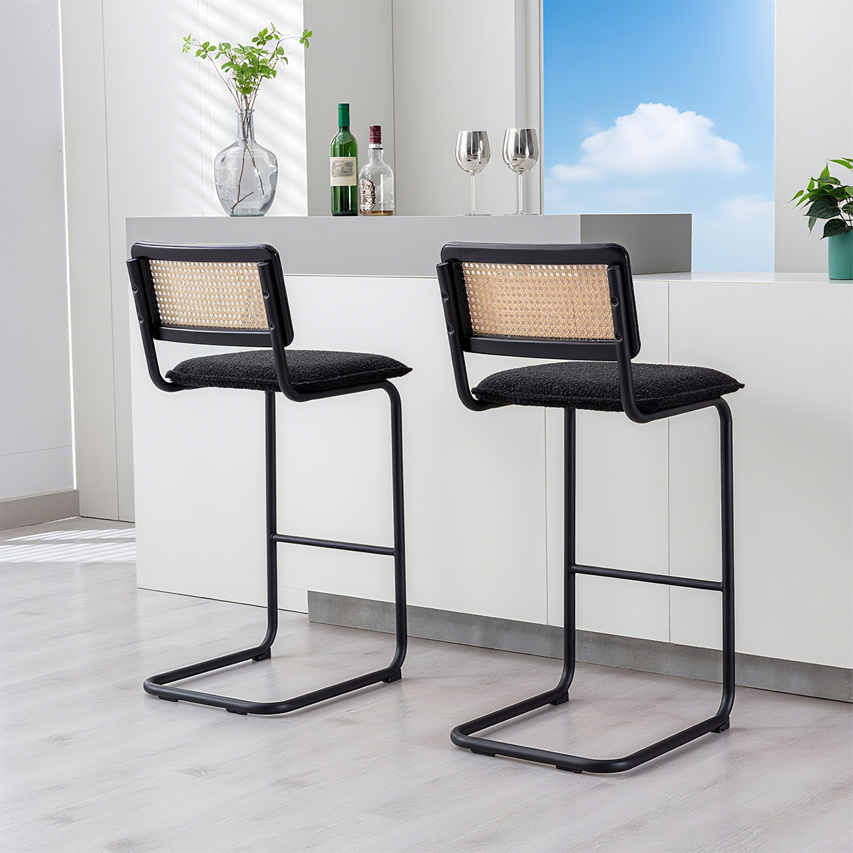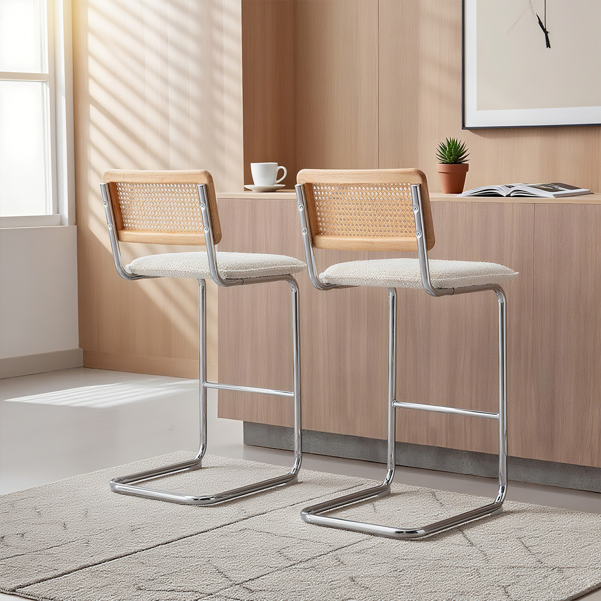 Modern boucle bar stool with cane back, mid-century rattan counter stool, chrome base kitchen island chair, upholstered bar chair with hand-woven rattan backrest, natural rattan and metal barstool, Scandinavian breakfast bar seating, stylish boucle dining chair, minimalist cantilever bar stool, Duomei Furniture OEM bar chairs, wholesale cafe chairs with boucle seat, modern bar seating for home and hospitalidad.