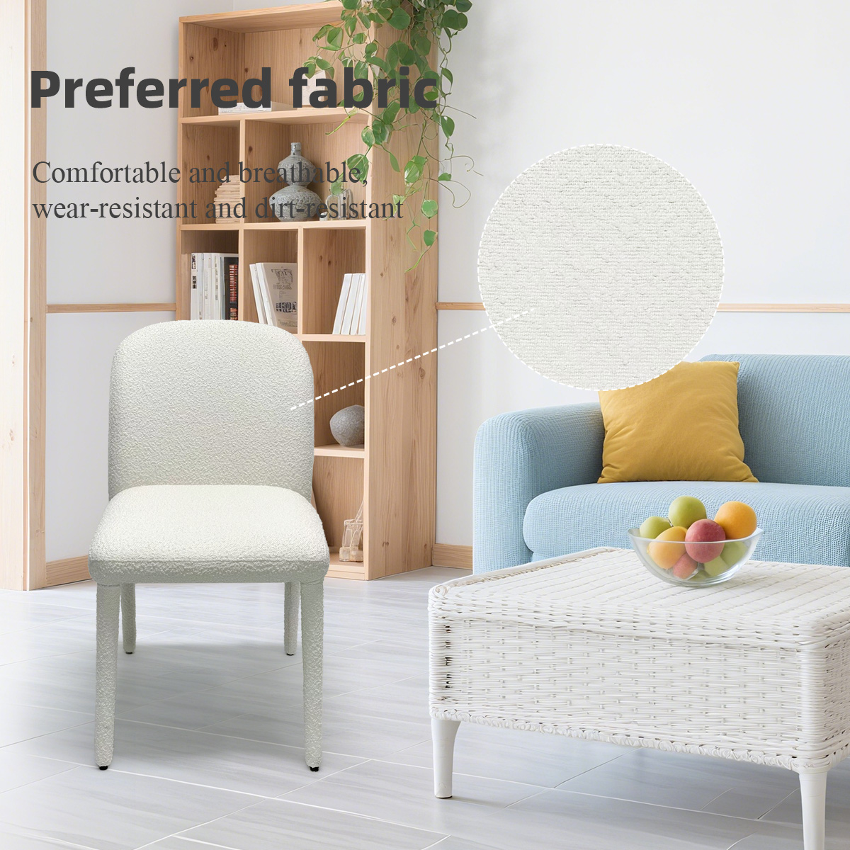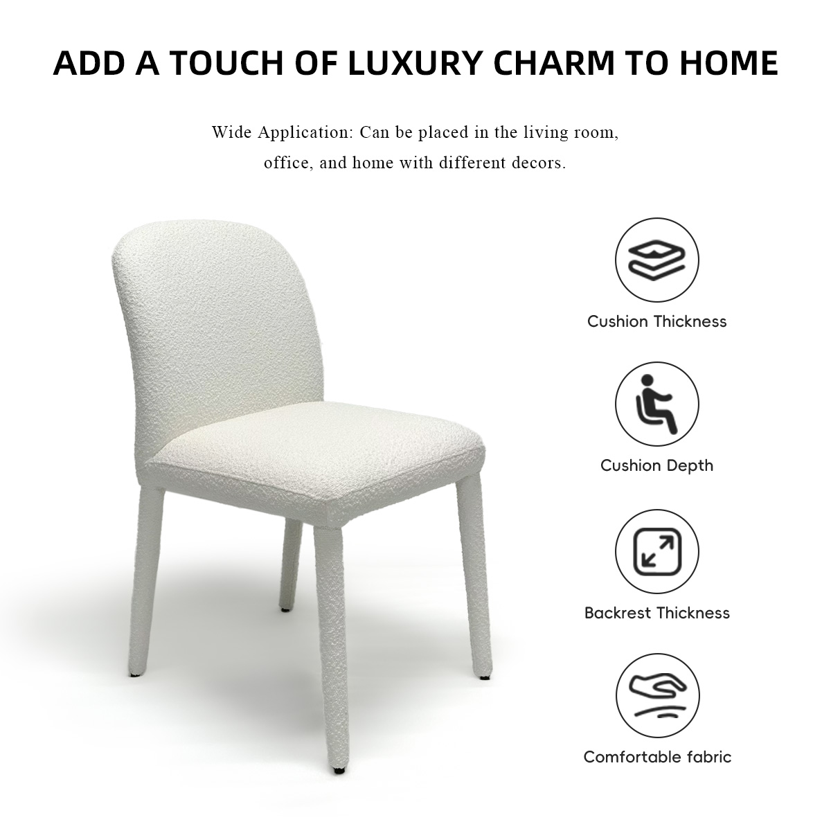 Esta silla de comedor sin brazos de marfil es un excelente ejemplo de nuestra artesanía moderna: una tela suave de boucle suave, construcción estable de abedul y metal, y comodidad ergonómica, se usa ampliamente en interiores residenciales, salones de hotel, restaurantes y áreas de vestuario. Diseñado con durabilidad de grado comercial y estilo minimalista, esta pieza es perfecta para pedidos masivos, distribución al por mayor o etiquetado privado de comercio electrónico.