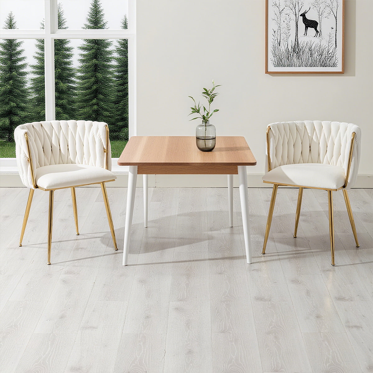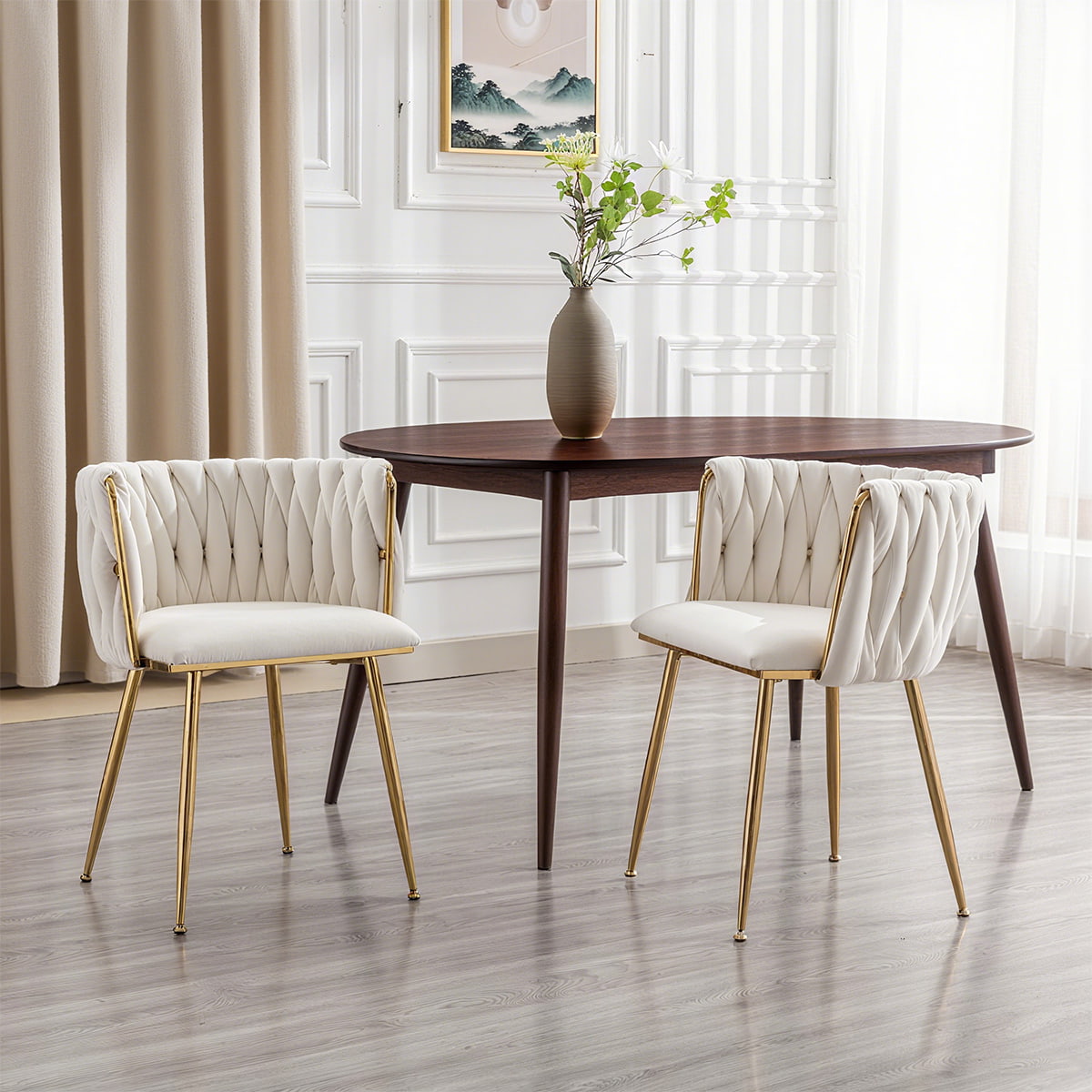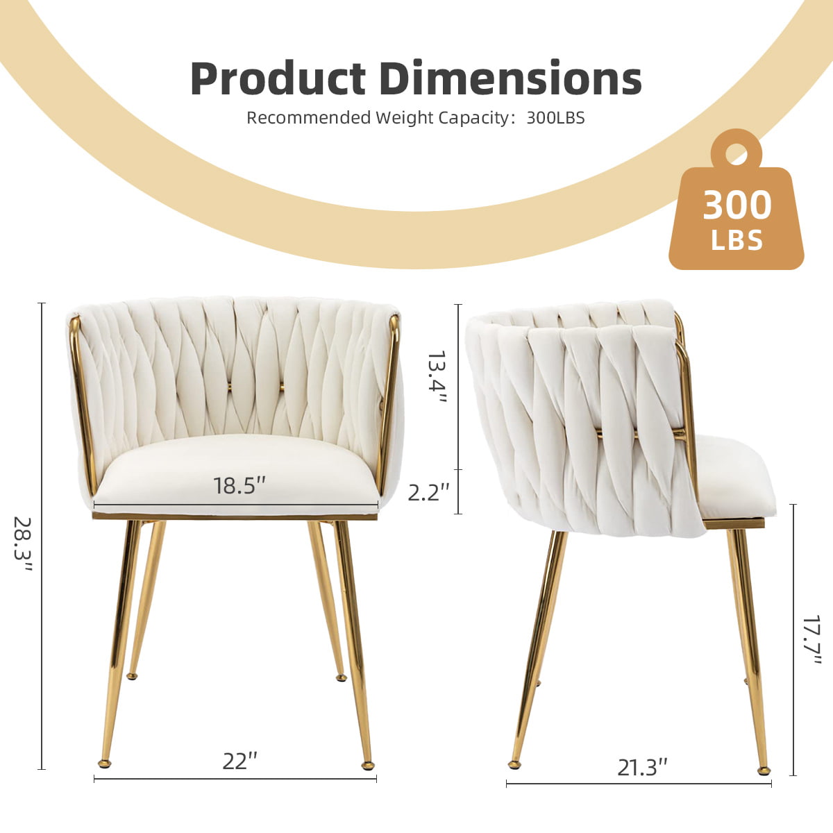 Esta silla de comedor tapizada en terciopelo marfil con respaldo tejido es una silla decorativa moderna y versátil, un taburete de tocador y una silla auxiliar de mediados de siglo. Con tela de terciopelo de lujo, patas de metal dorado, respaldo ergonómico y cojines de espuma de alta densidad, está diseñado para ofrecer comodidad y estilo. Ideal para comedores, salas de estar, dormitorios, tocadores, oficinas, cafeterías y hoteles, satisface las necesidades tanto de usuarios domésticos como de compradores comerciales.