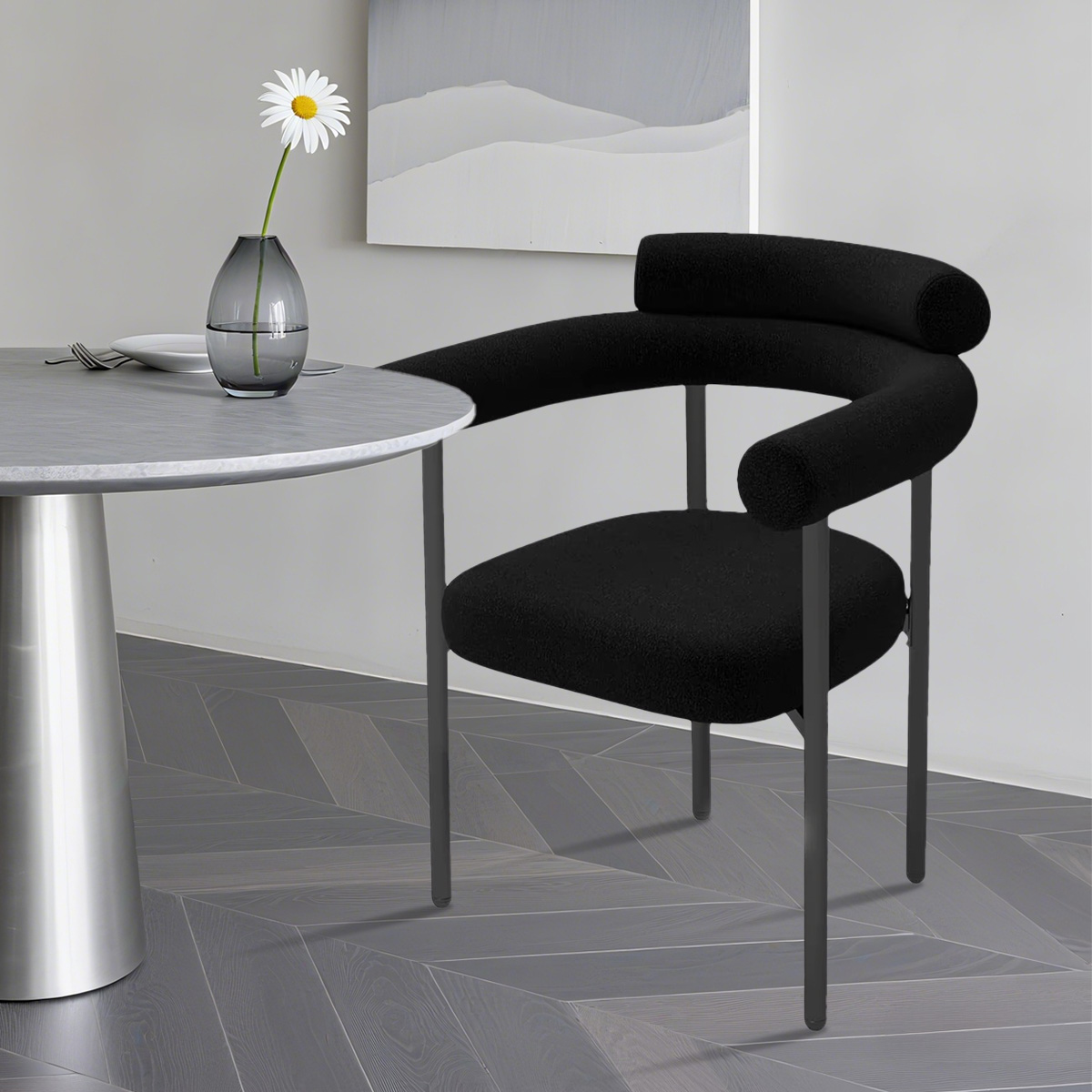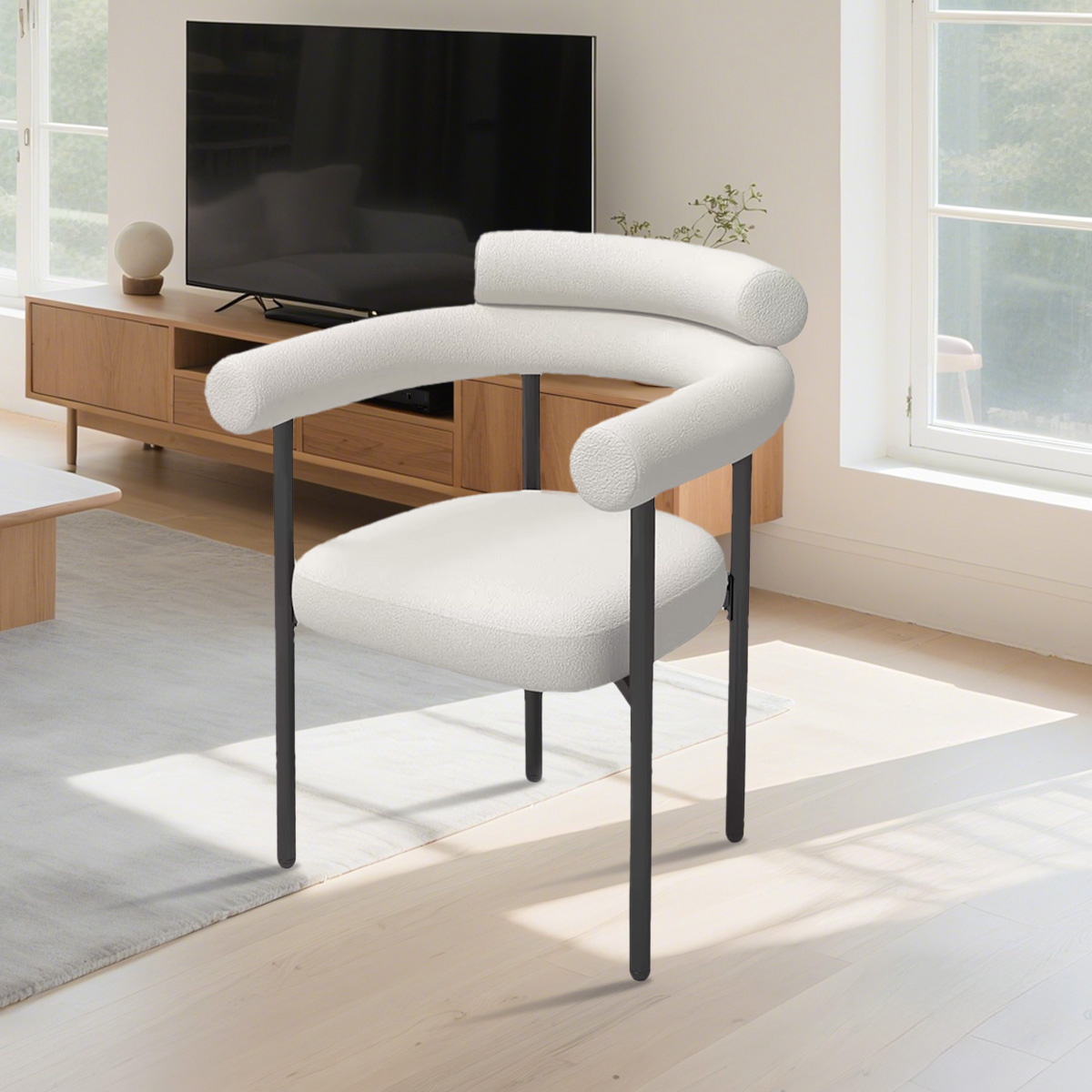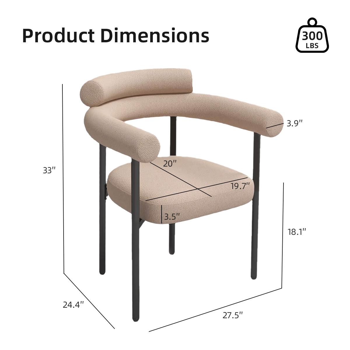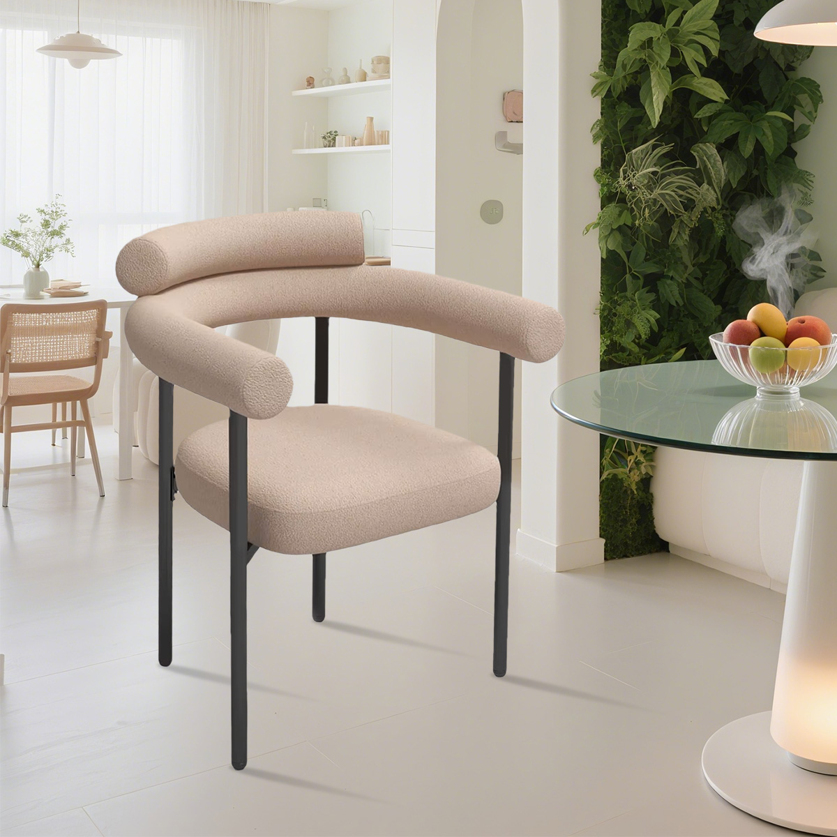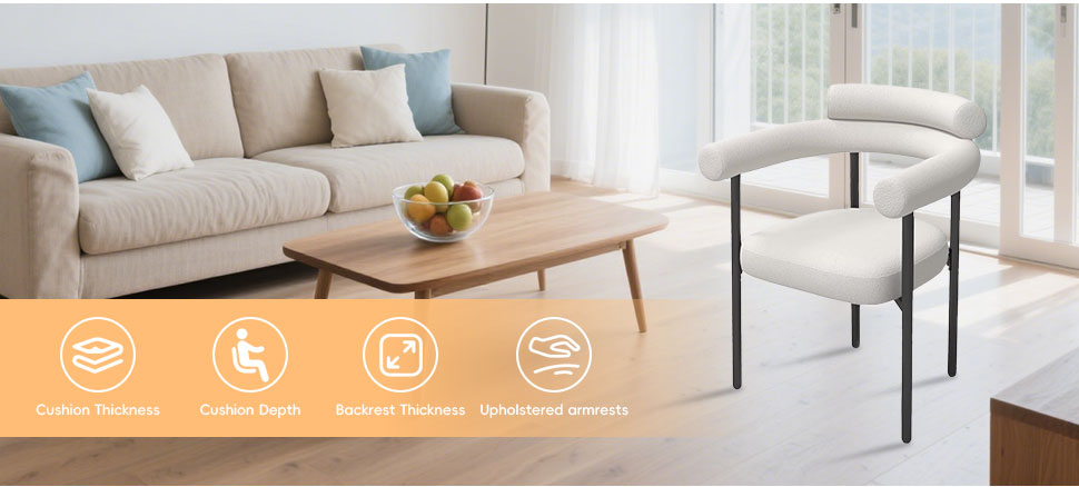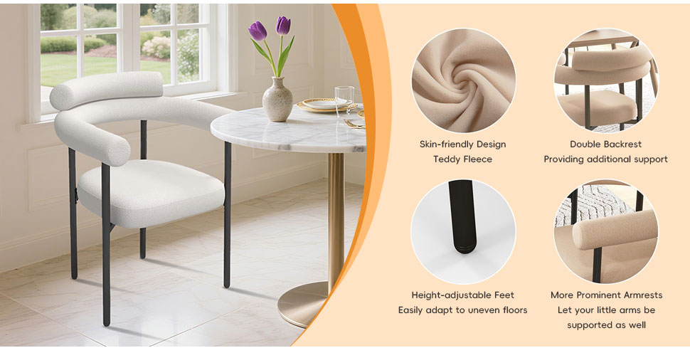 Nuestro producto insignia: esta silla de comedor está hecha de tela de terciopelo de peluche, que es suave y delicada para el tacto, trayendo una experiencia cálida y mejorada y mejora el estilo de la casa. El respaldo adopta un diseño de doble respaldo para proporcionar un mejor soporte lumbar y se combina con reposabrazos suaves. Las patas de la silla están hechas de material de metal negro, con líneas simples y ordenadas, estables y duraderas. Está disponible en tres colores versátiles: marrón claro, blanco y negro, que pueden combinar diferentes estilos de entornos de restaurantes.