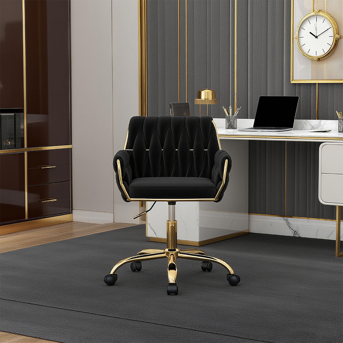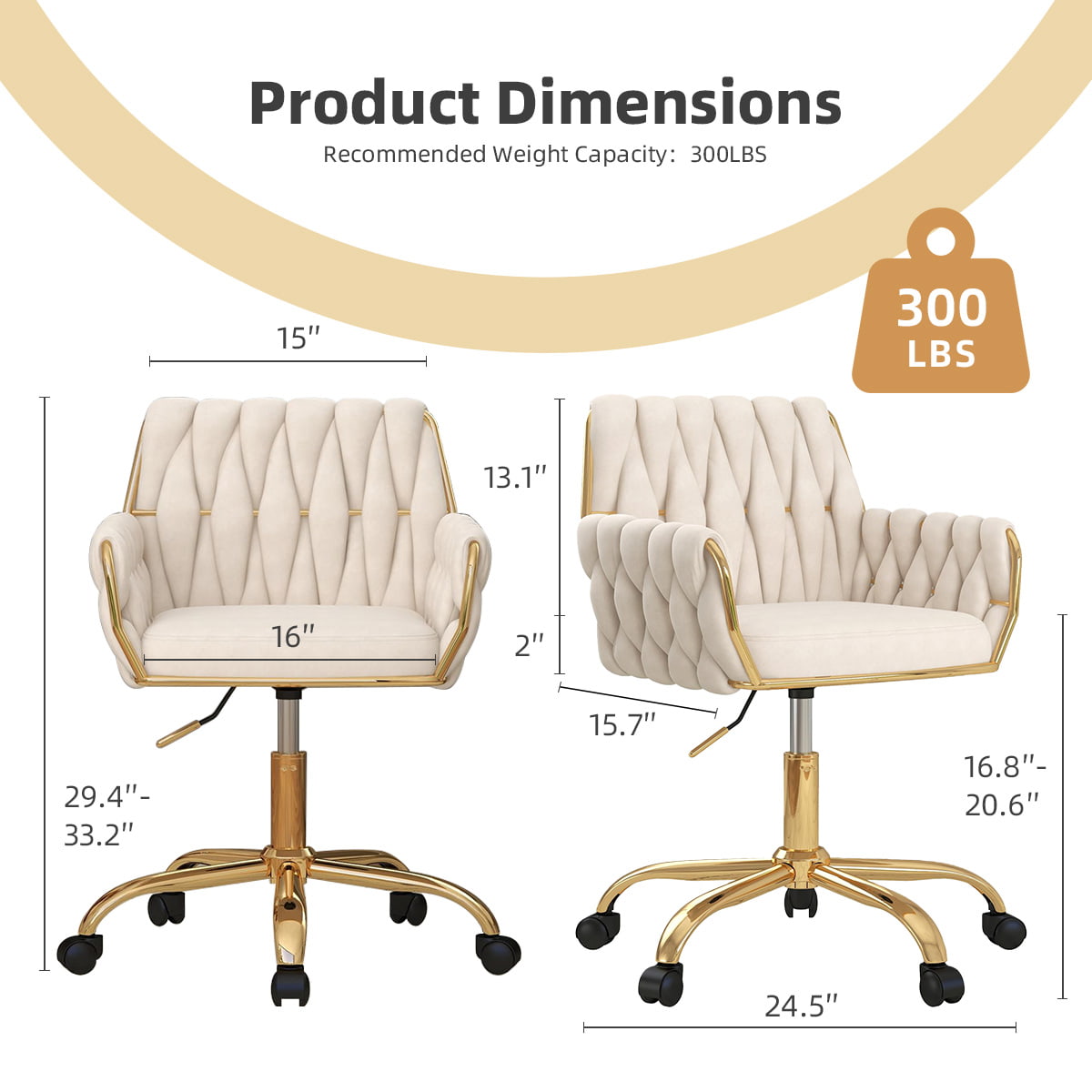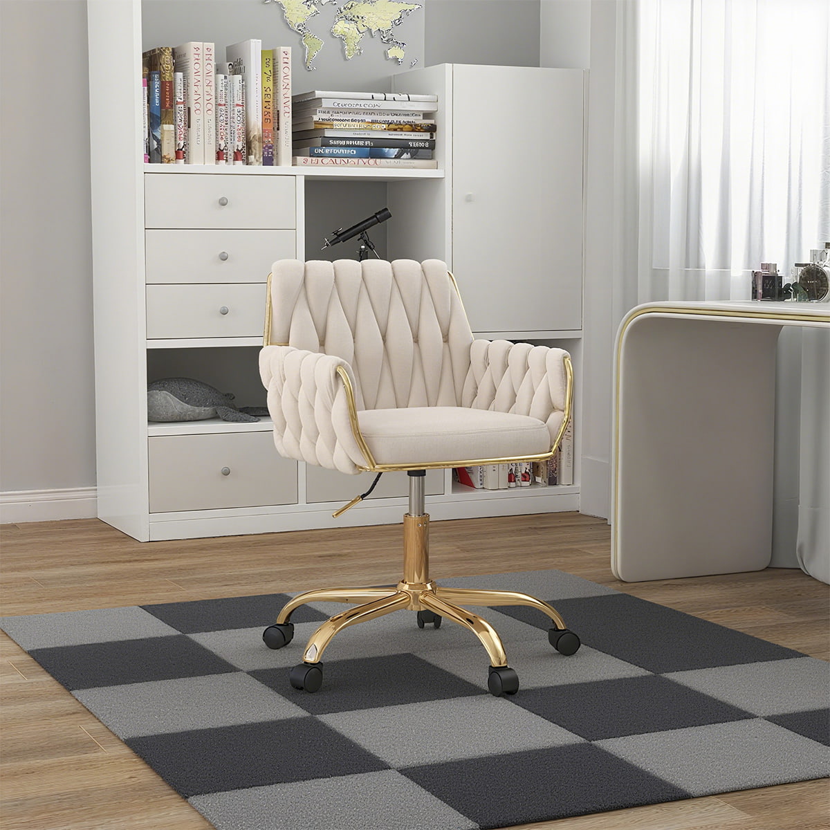 Silla de oficina en casa de terciopelo beige – Silla de tocador ajustable moderna con base dorada, respaldo y apoyabrazos tejidos a mano, silla de escritorio giratoria de 360°