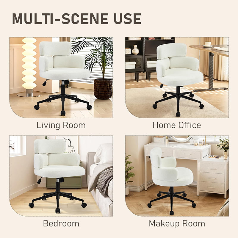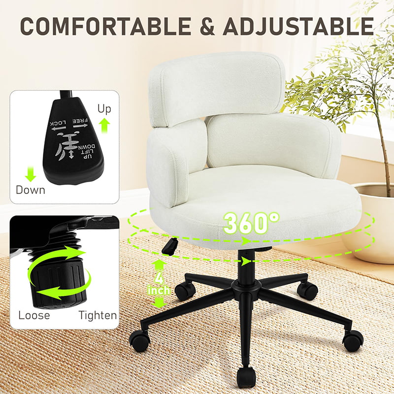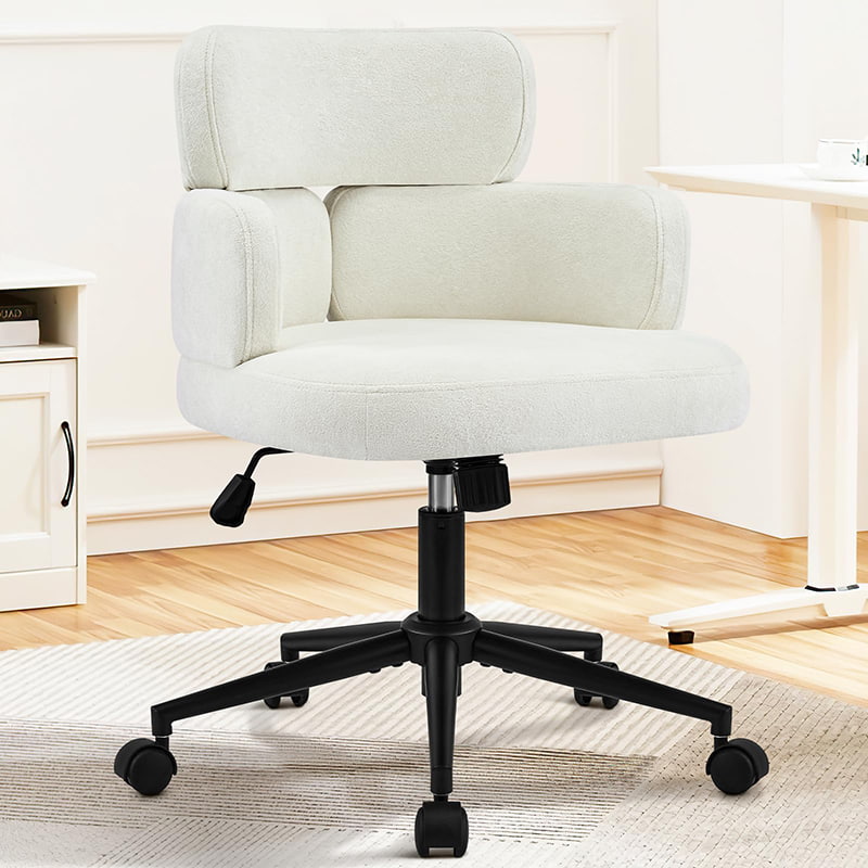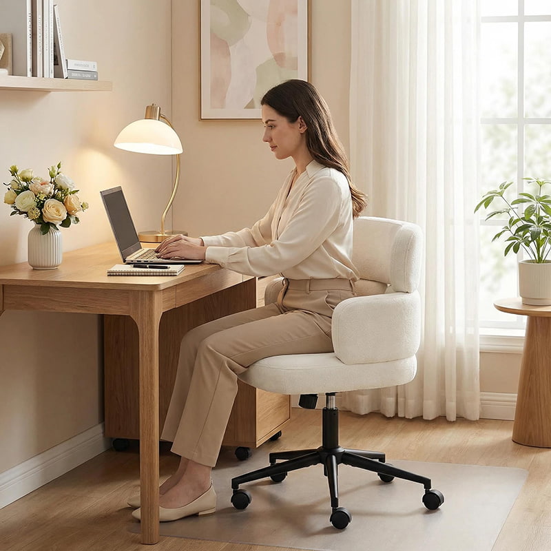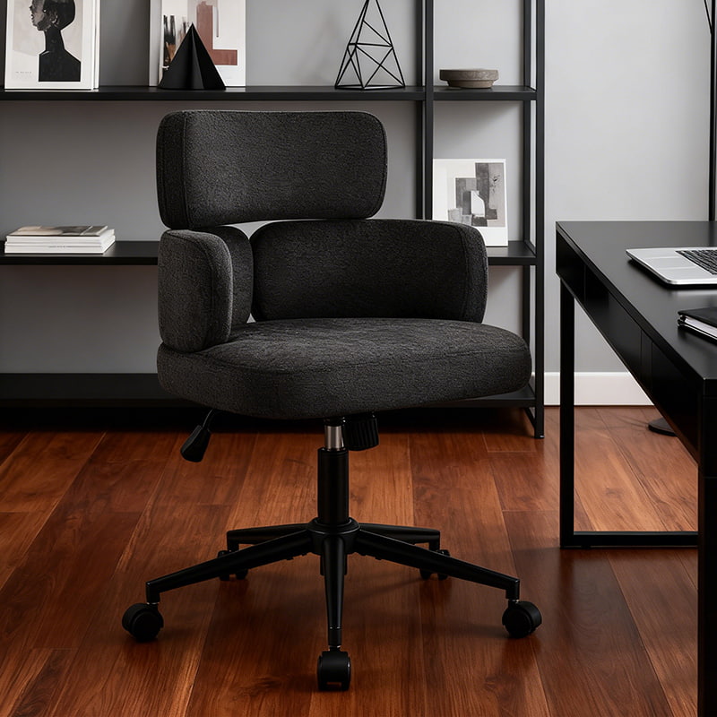 Esta silla de oficina giratoria tapizada está diseñada para oficinas domésticas modernas, espacios de trabajo boutique e interiores centrados en el estilo de vida. Con un distintivo respaldo en forma de trébol con reposabrazos integrado, esta silla combina atractivo visual con ergonomía funcional. El asiento amplio y suavemente acolchado está tapizado con una tela de chenilla que no daña la piel y ofrece una experiencia de asiento lujosa y cómoda para largas horas de trabajo, lectura o relajación. Un mecanismo de altura ajustable, un giro suave de 360 grados y una función de balanceo suave permiten a los usuarios personalizar su posición de asiento con facilidad, mientras que la base de metal resistente y las ruedas giratorias silenciosas garantizan estabilidad, movilidad y protección del piso en diferentes entornos.