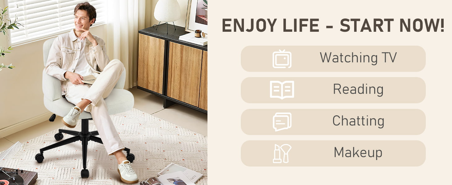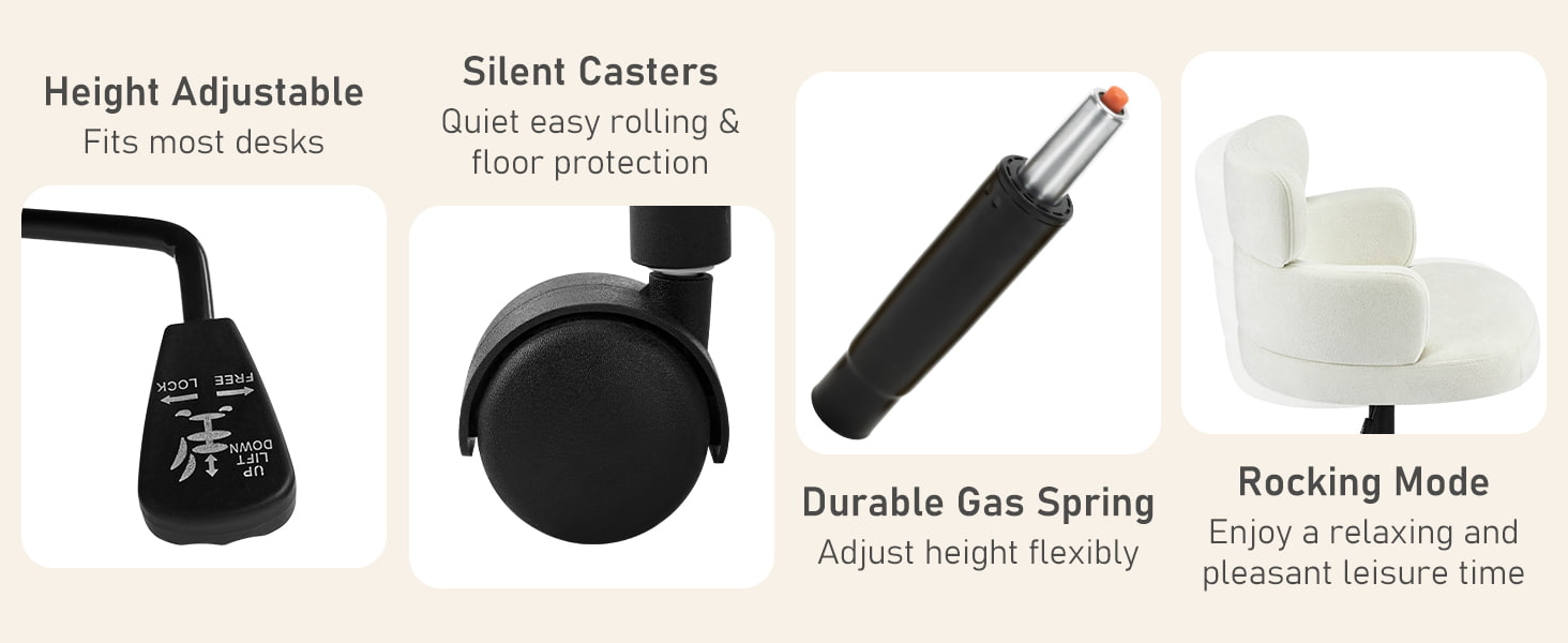 Envuelta en tela de chenilla transpirable y sostenida por un grueso cojín de espuma, la silla brinda comodidad duradera para trabajar, leer o relajarse. La altura del asiento ajustable, el giro suave de 360° y la suave función de balanceo permiten a los usuarios personalizar fácilmente su posición al sentarse. Una base de metal resistente con ruedas silenciosas garantiza estabilidad, movilidad y protección del piso, lo que la convierte en una solución de asiento práctica y elegante para la vida contemporánea.