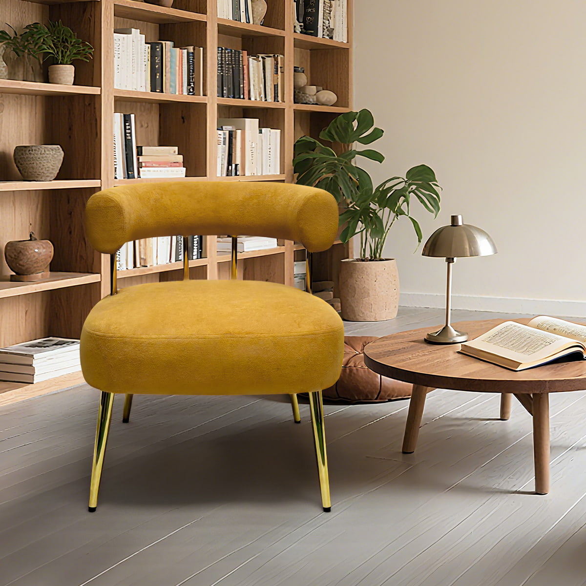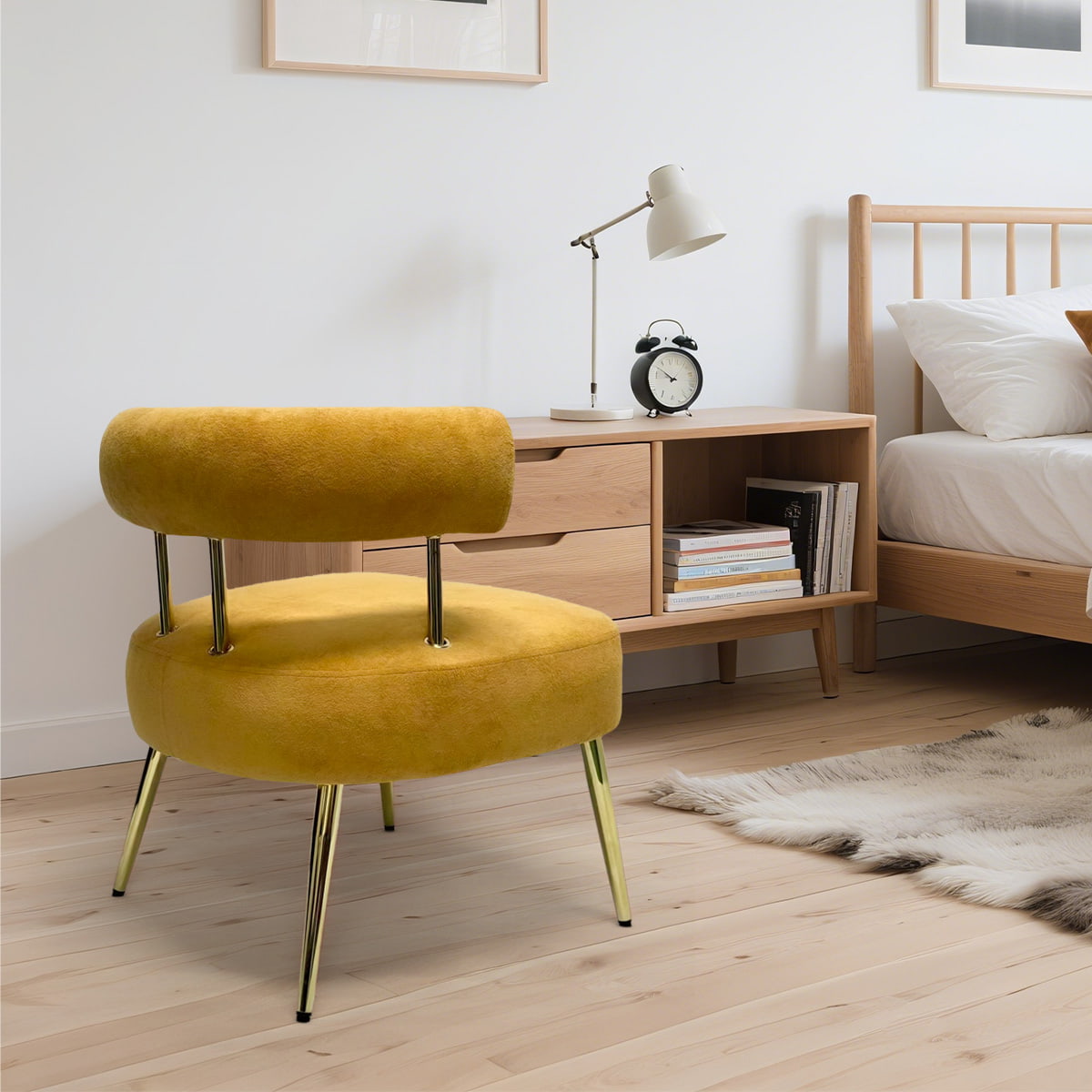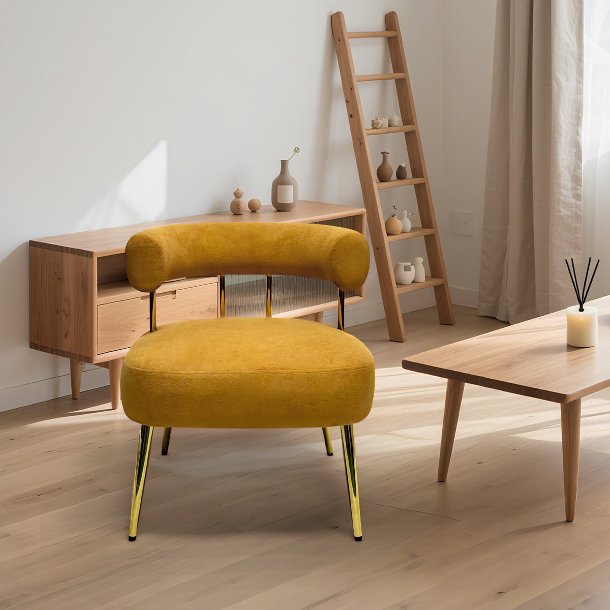 Silla de acento de barril de terciopelo dorado: sillón moderno de comedor y salón moderno de mediados de siglo