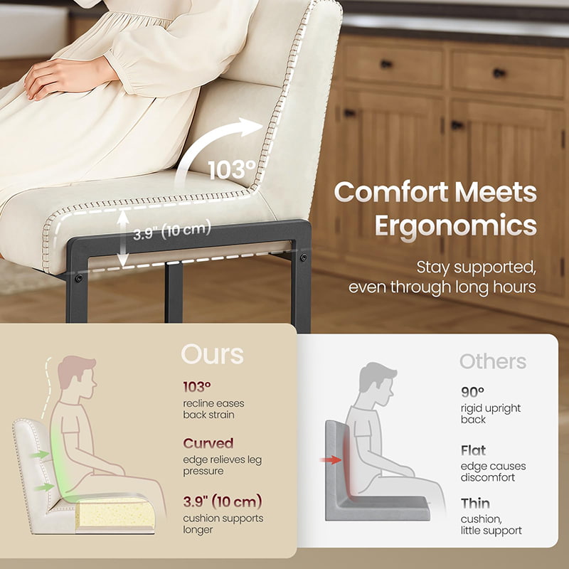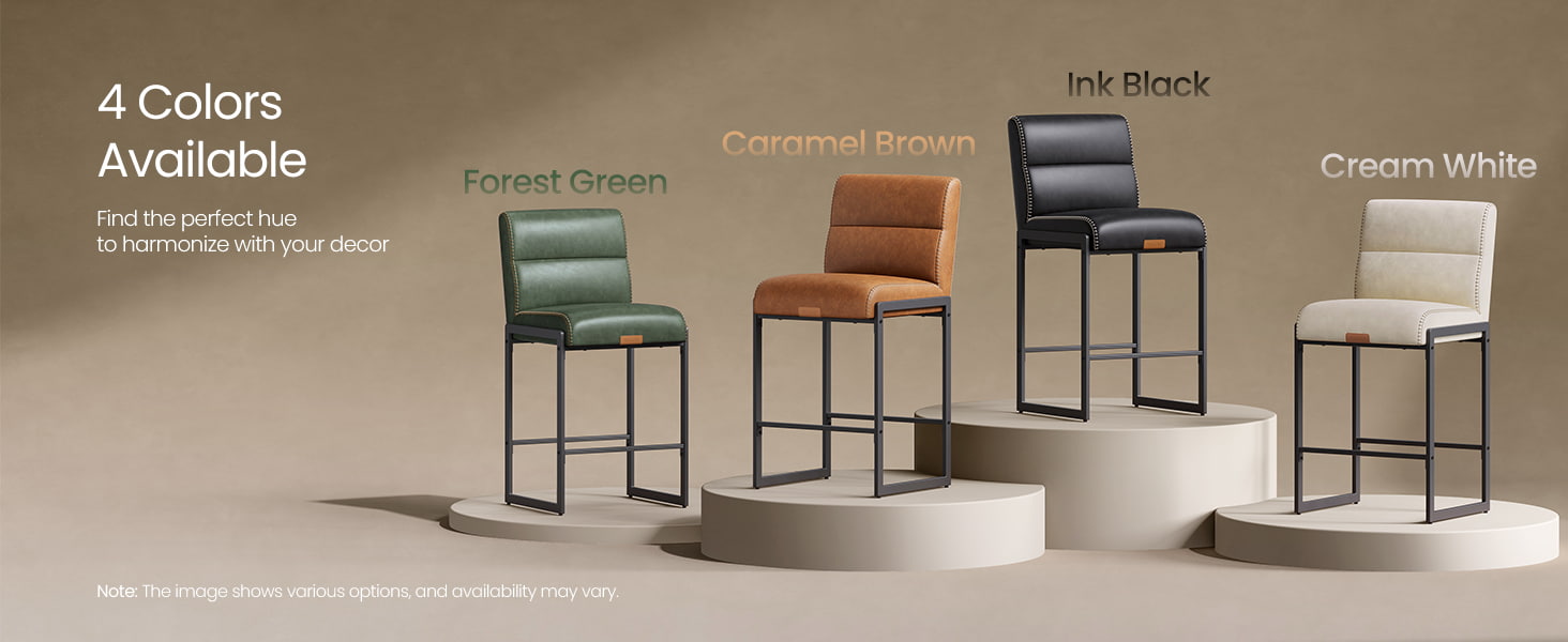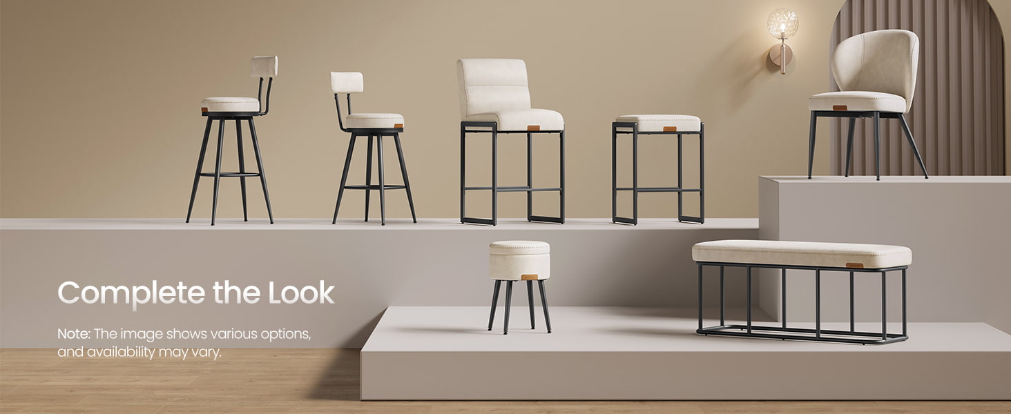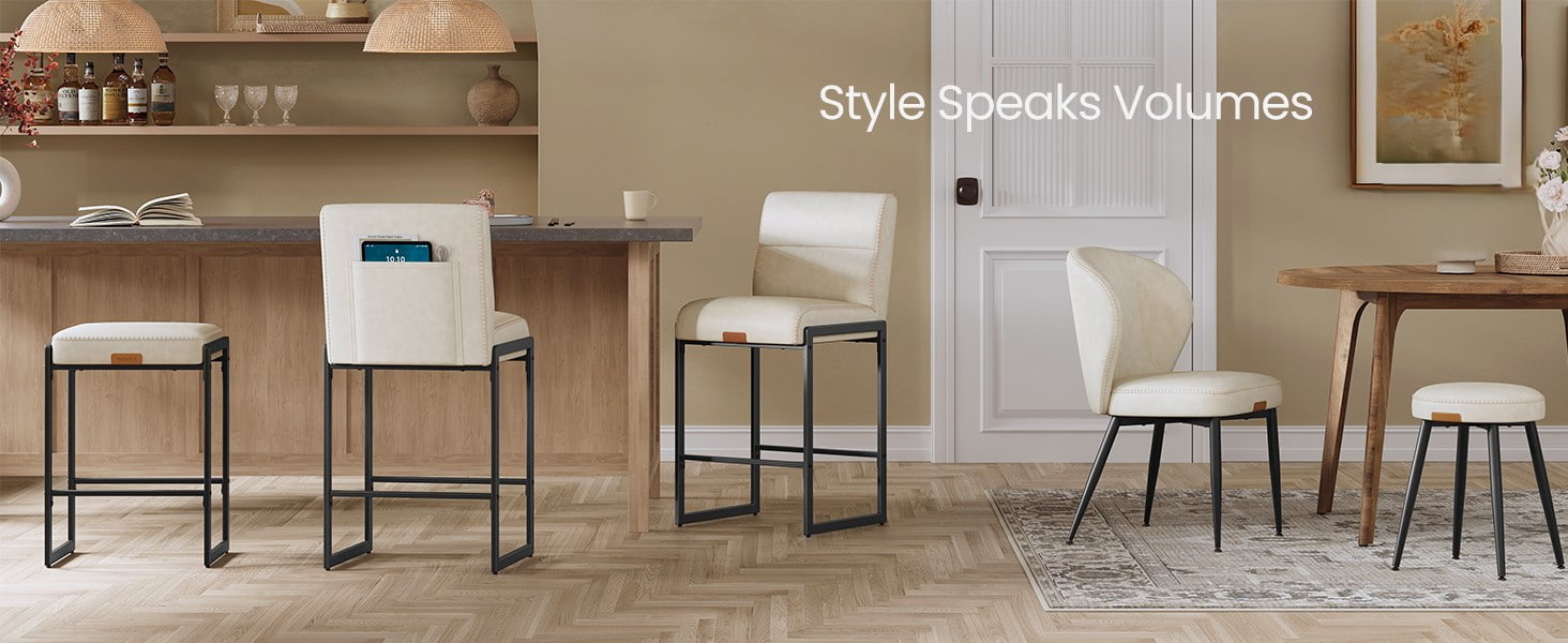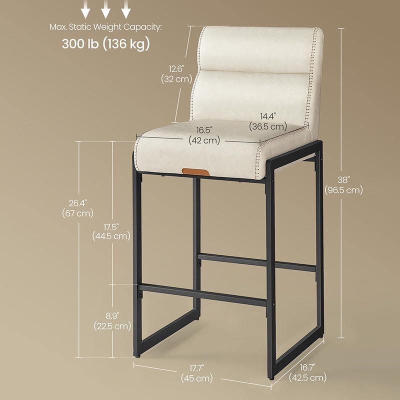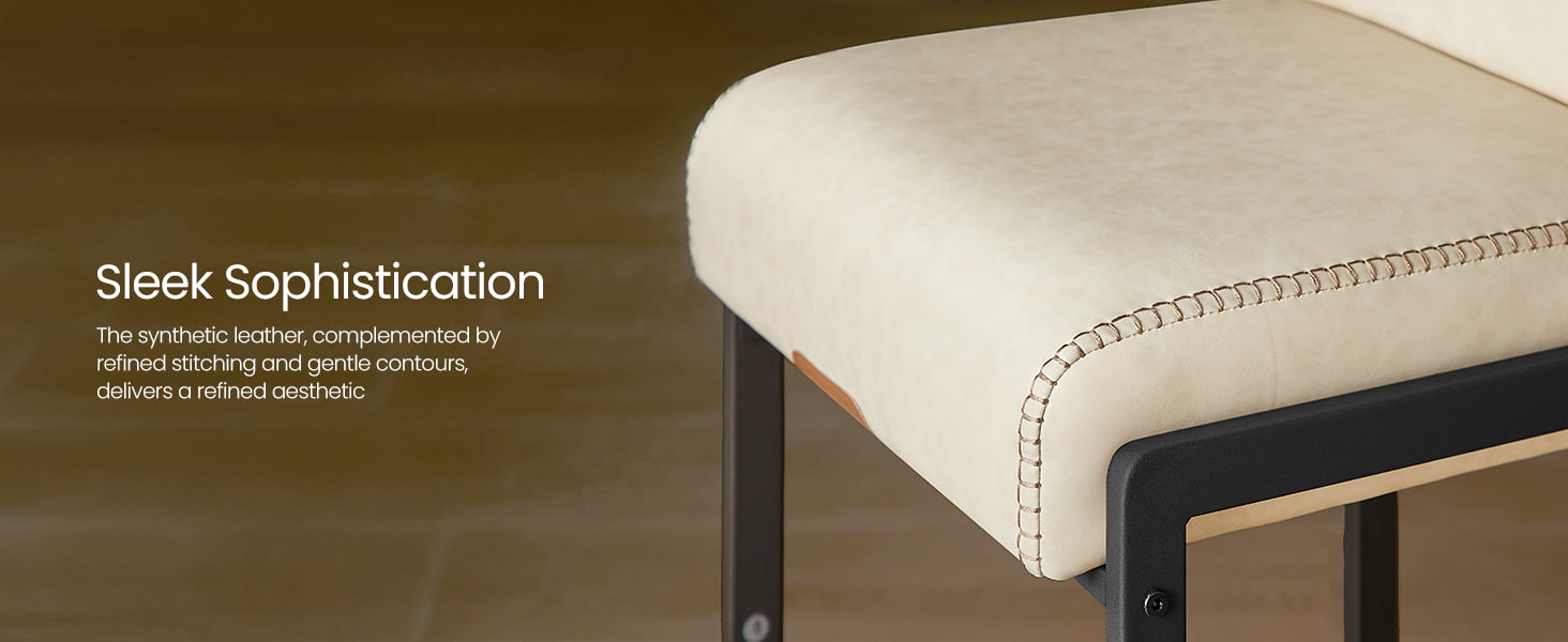 Taburetes de bar modernos de mediados de siglo diseñados para encimeras de cocina e islas de comedor, estas sillas altas en color blanco crema cuentan con tapicería de cuero sintético duradero con costuras refinadas y una estructura metálica arquitectónica limpia. El respaldo ergonómico segmentado de 103 grados, el asiento acolchado de 3,9 pulgadas de espesor y el borde frontal curvo brindan comodidad duradera para sentarse por períodos prolongados, lo que los hace adecuados tanto para cocinas residenciales como para entornos comerciales livianos, como cafeterías o salas de exposición.