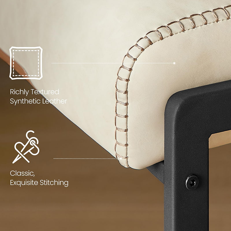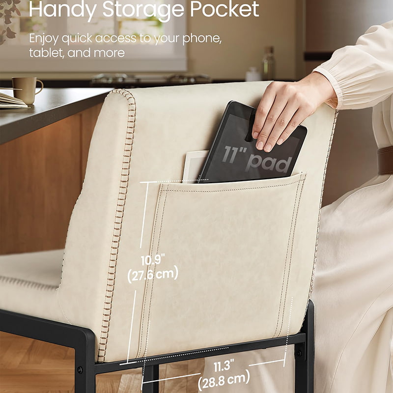 La suave superficie de cuero sintético está detallada con costuras sutiles, lo que brinda una apariencia artesanal y al mismo tiempo es fácil de mantener, ideal para hogares ocupados y entornos comerciales ligeros. Un borde del asiento suavemente curvado ayuda a reducir la presión en las piernas, mientras que el bolsillo trasero integrado agrega un almacenamiento conveniente para teléfonos, tabletas o pequeños artículos esenciales. Sostenido por una estructura de metal resistente con pies ajustables ocultos, este taburete de bar garantiza estabilidad en varias superficies de piso y se adapta sin esfuerzo a cocinas, comedores o áreas de entretenimiento informales modernas.