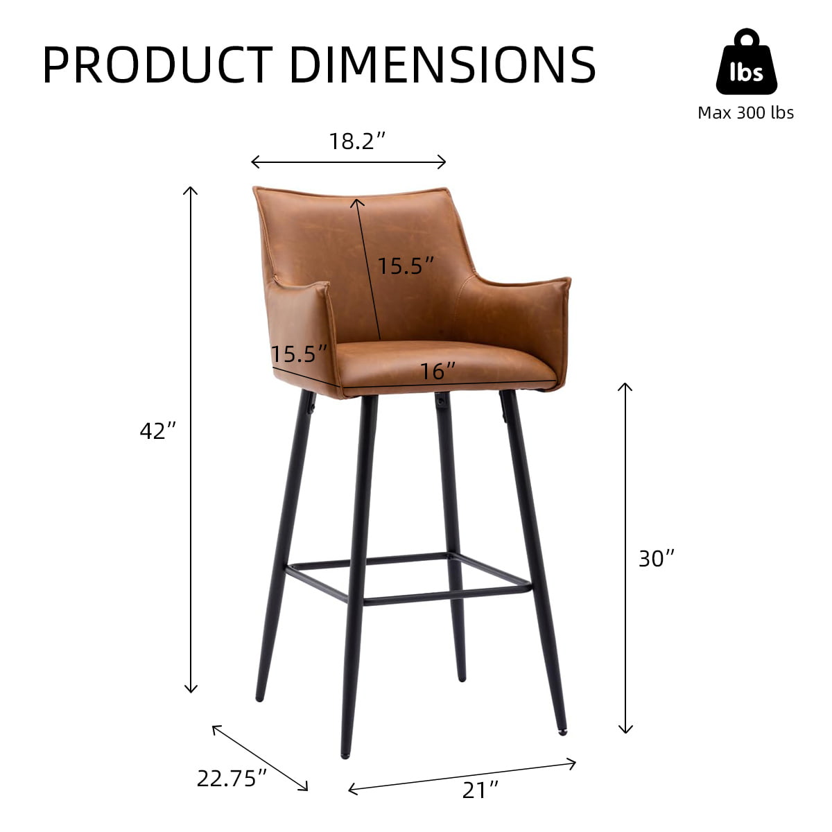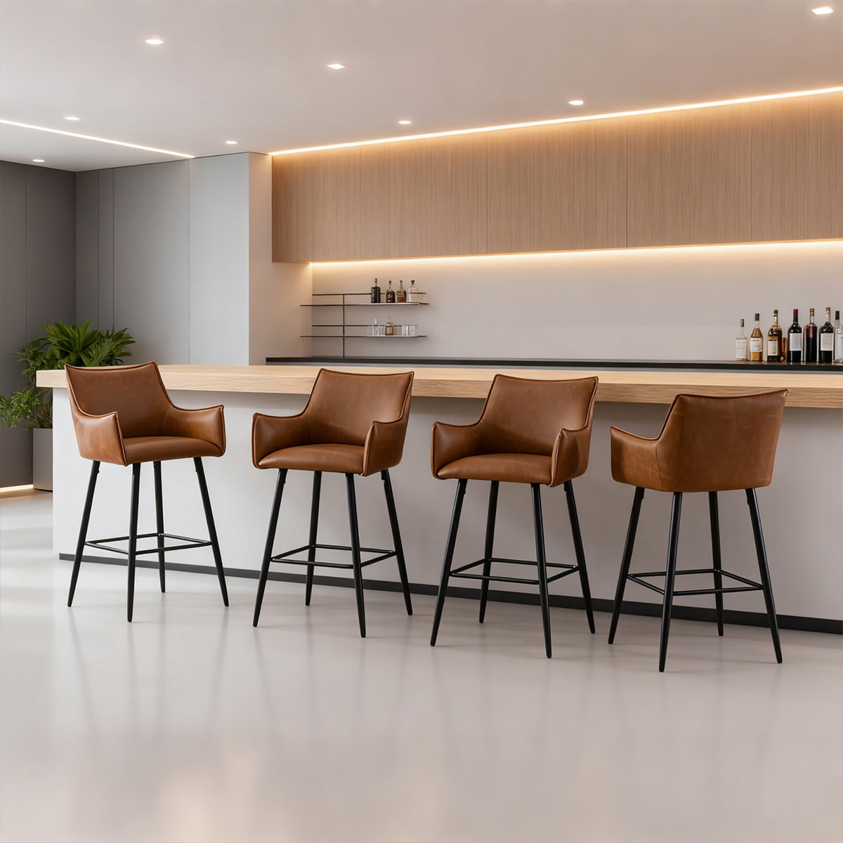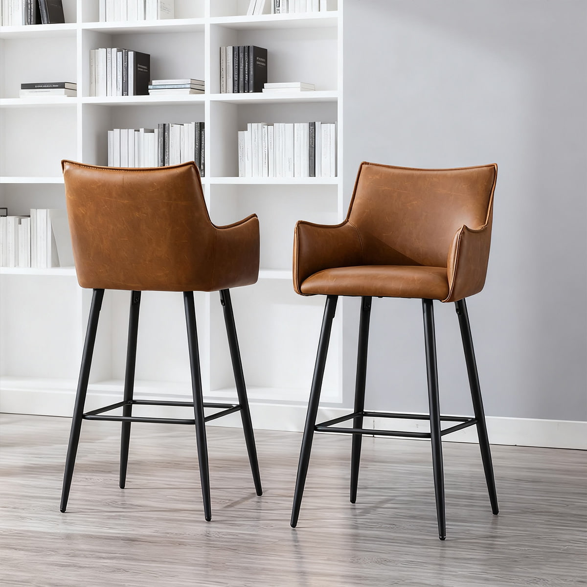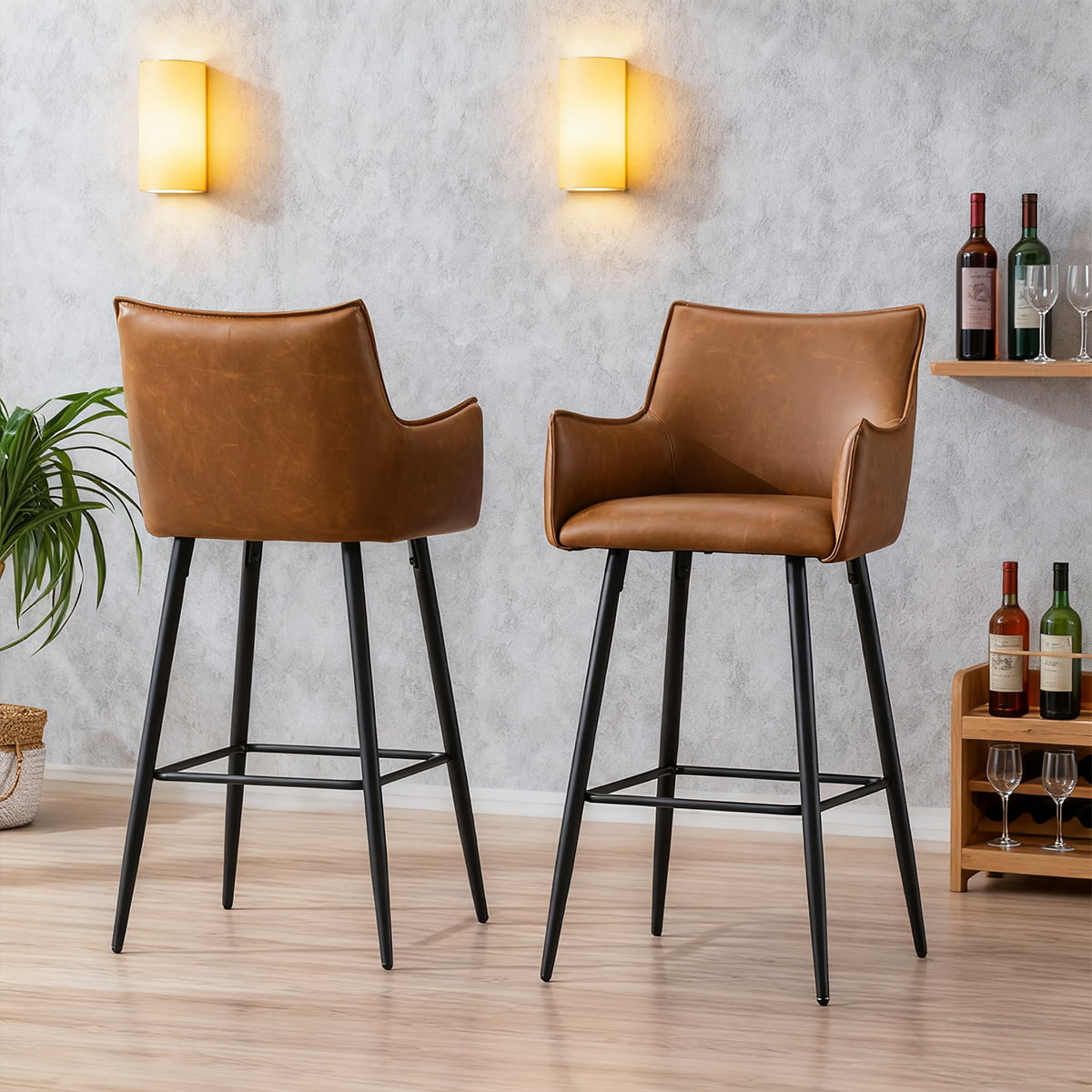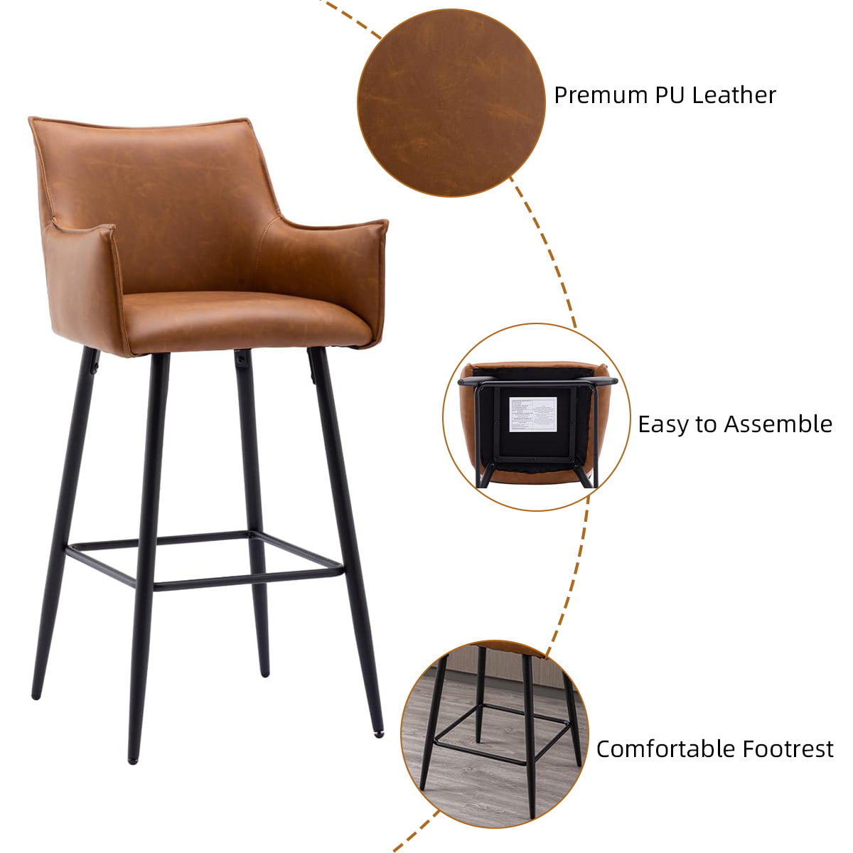 Taburete de bar moderno de piel sintética marrón con reposabrazos y respaldo, silla de bar tapizada a la altura del mostrador con patas de metal negro para isla de cocina, bistró o bar en casa