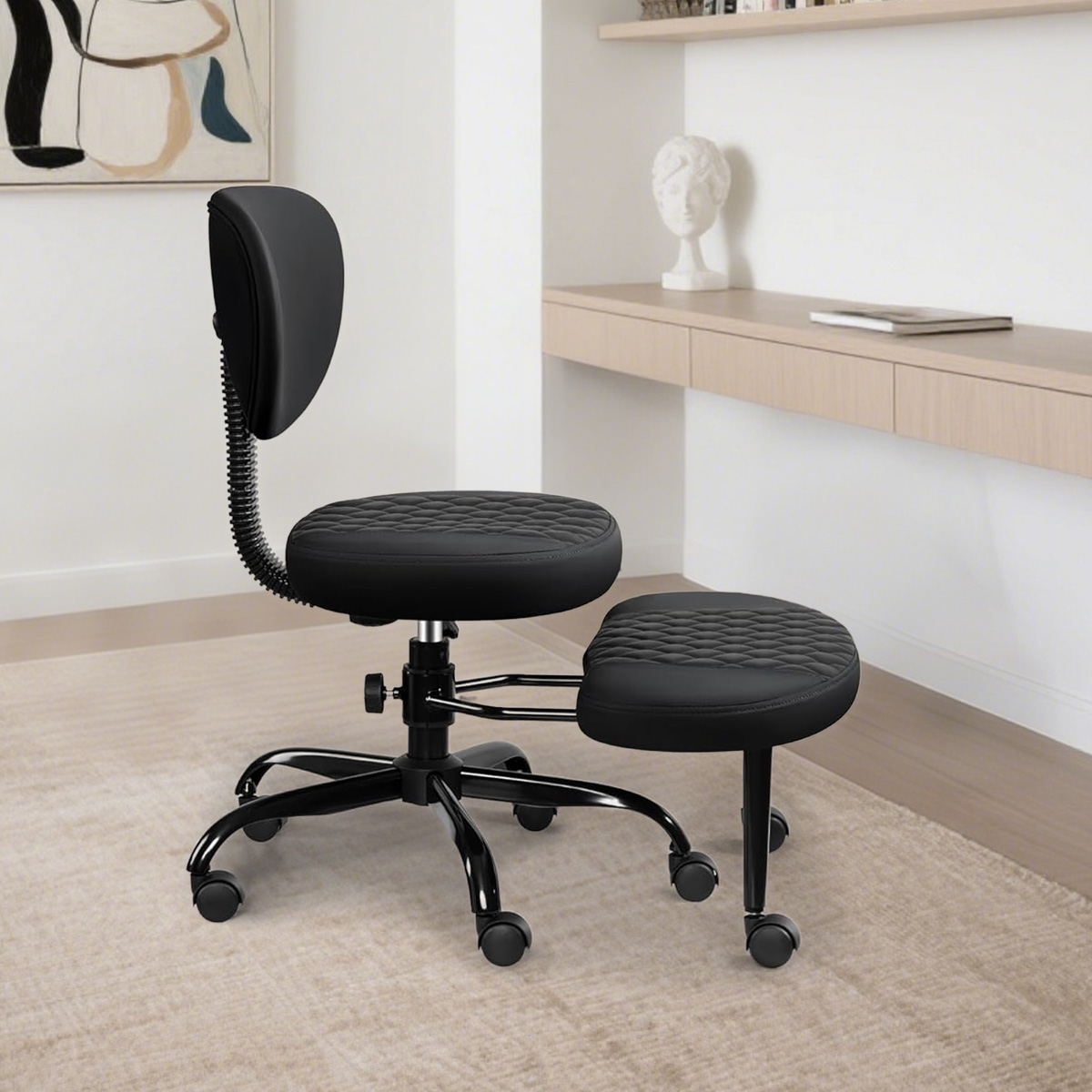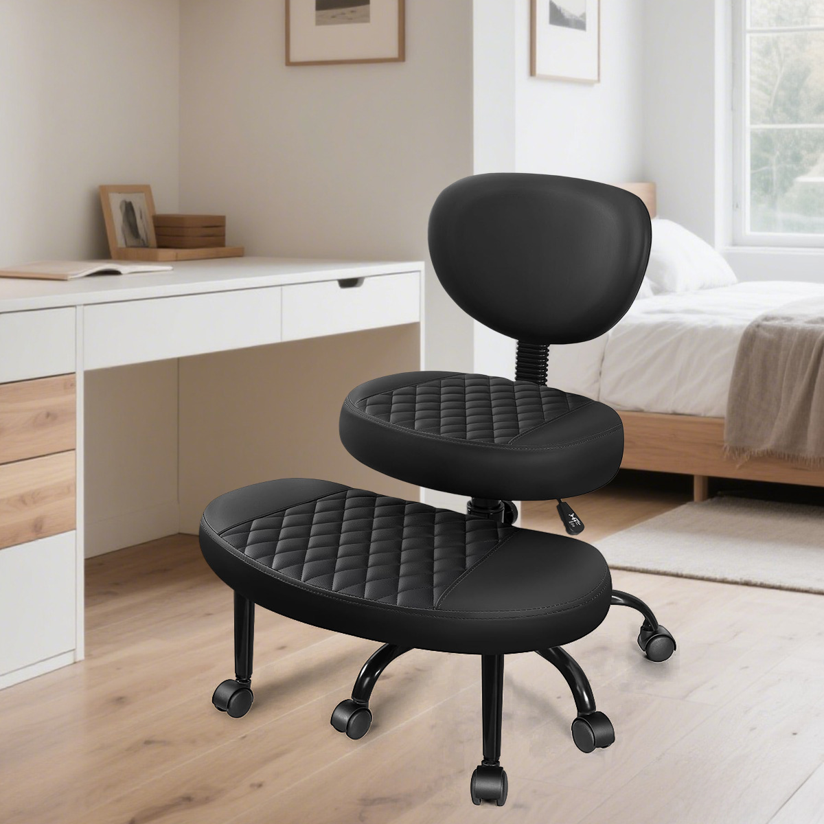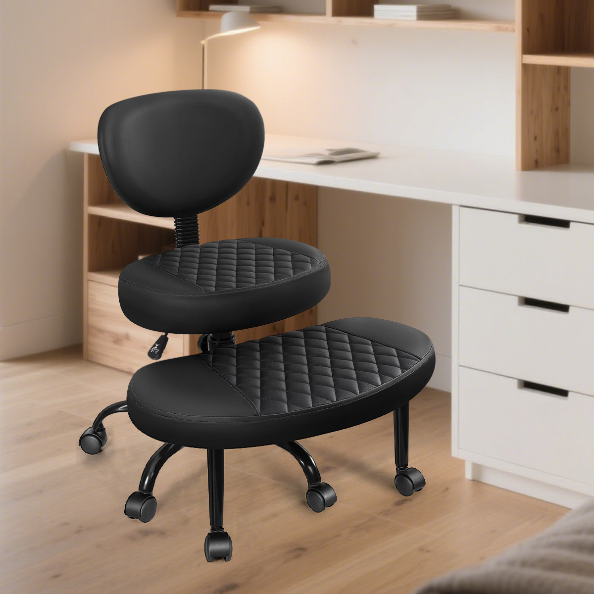 LEER MÁSEsta innovadora silla de oficina ergonómica está diseñada para una sesión de patas cruzadas, combinando la comodidad con el estilo moderno. Hecho de material de PU de alto rebound, es suave al tacto y fácil de limpiar, y disponible en dos colores simples: blanco y negro. El cuerpo de la silla está soportado por un marco de acero de aleación, que es estable y duradero; El reposapiés giratorio de 360 ° permite que sus pies se muevan libremente, aliviando la presión de sentarse durante mucho tiempo. La función ajustable de altura es adecuada para diferentes computadoras de escritorio, y está equipada con ruedas universales flexibles para un movimiento suave y silencioso.
